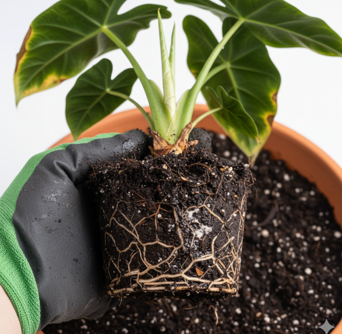 根腐れが始まっている場合は、まず鉢から株を抜き、古い土を優しく取り除きます。そして、黒く変色したり、触るとドロドロしたりしている腐った根を、清潔なハサミで切り取ってください。同時に、黄色く変色したり茶色く枯れたりした葉や茎も、感染の拡大を防ぐために切り取ります。次に、水はけの良い新しい土で植え替えを行います。