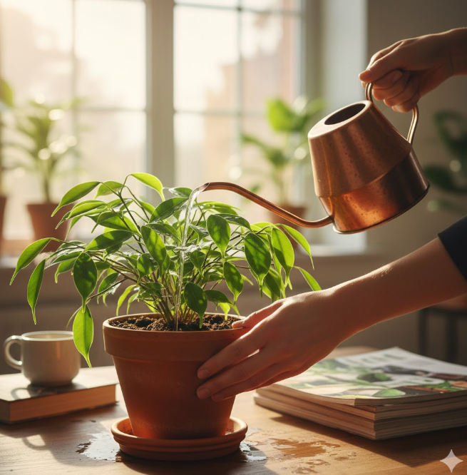 植え替え後の話だけでなく、日常の水やりも土の健康に直結します。ベンジャミンの生育期(春から秋)は、土の表面が乾いたらすぐに水を与えるのではなく、「土の表面がしっかり乾いてから」さらに少し待ってから、鉢底から流れ出るまでたっぷりと与える「乾湿のメリハリ」が大切です。