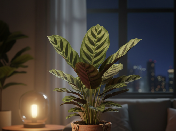 夜間は、カラテアが自然な暗さを感じられるように、部屋の照明を消すか、照明から離れた場所に置くことが重要です。また、冷暖房の風が直接当たる場所も避けてください。